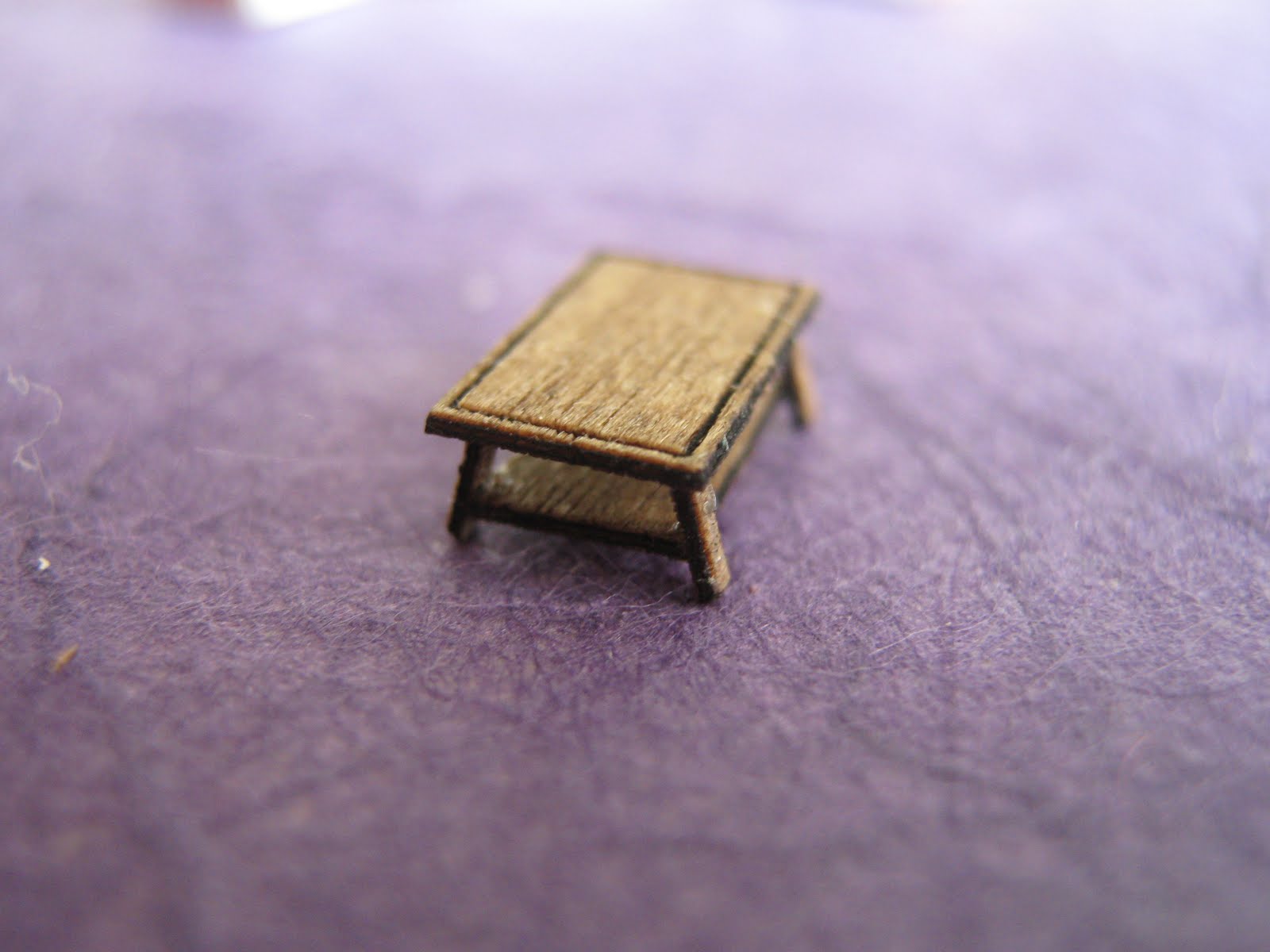 I ended up finding some time to work on the library furniture for my Baby House last night and then again this morning. I have built the coffee table and the two end tables. Susans instructions suggest that you can try and use the spacer, that is usually glued to the bottom of the table to show you where to place the legs, as a lower shelf. So I did just that and am really pleased with the results. I put the legs at a slight angle to try and give it a more elegant feel. I stained them all with a wood stain pen.